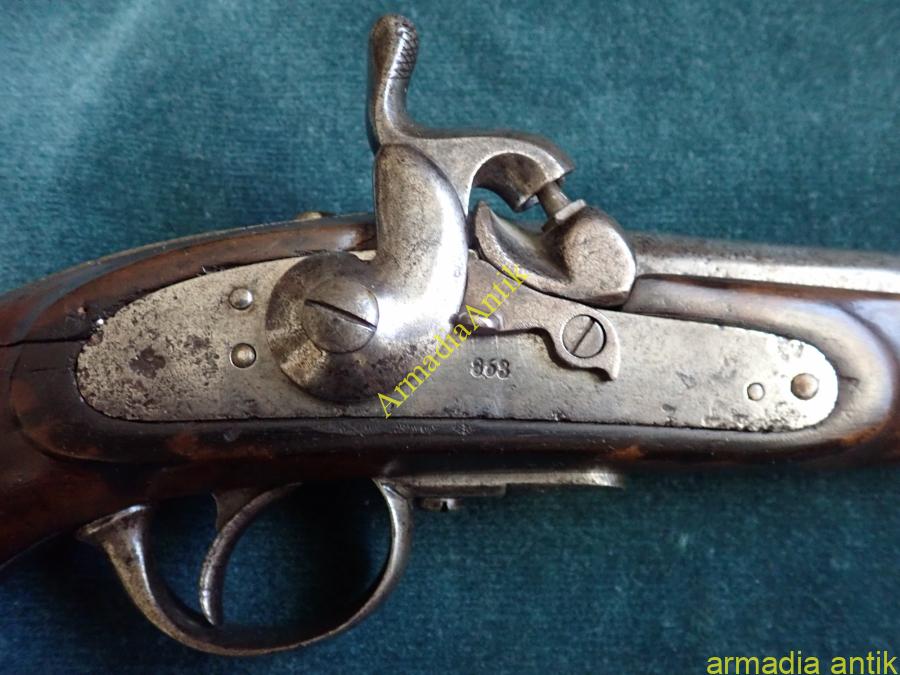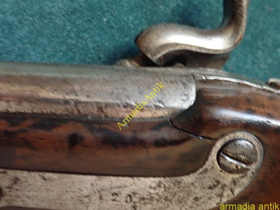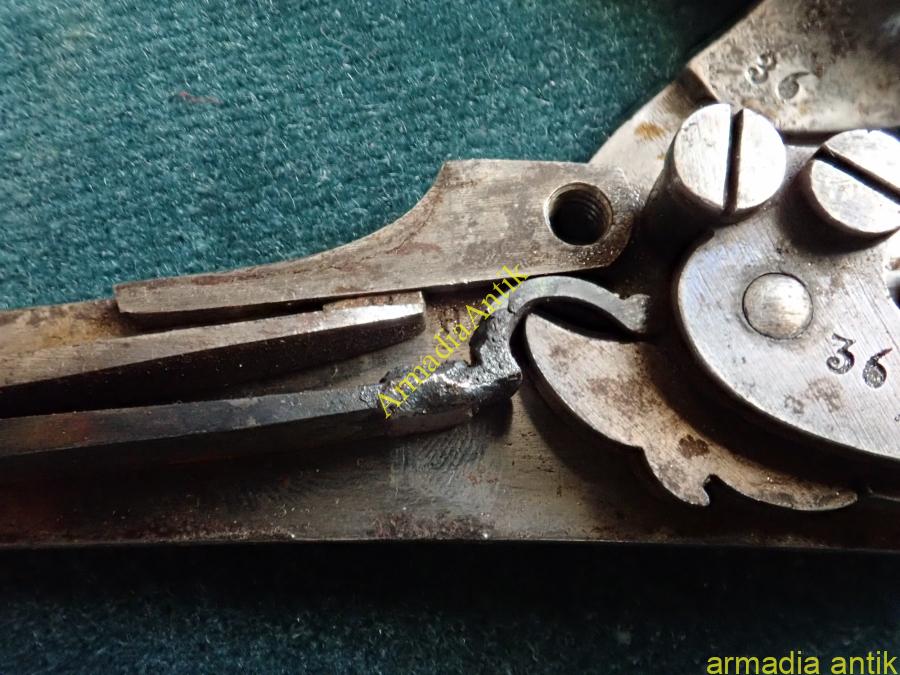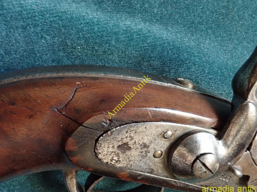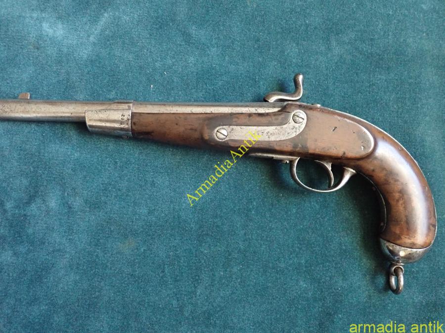 Az utolsó elöltöltős osztrák magyar lovassági pisztoly. Nagy tűzerjű, csappantyús/kapszlis huzagolt csövű fegyver, kakas biztosítóval. Korának megfelelő, de szép, eredeti gyűjteményi állapotban. A lakatszerkezete működik, a rugók erősek,. Az ütő/főrugó vége javított. Lásd a képeket.