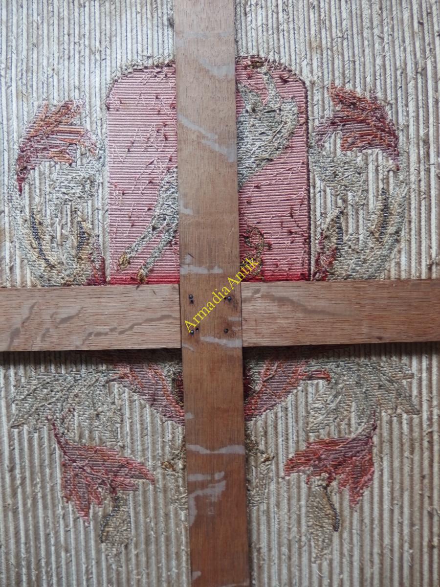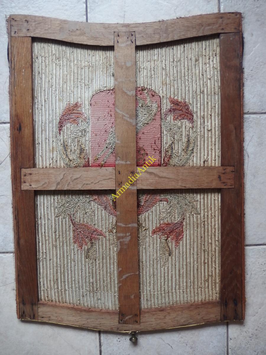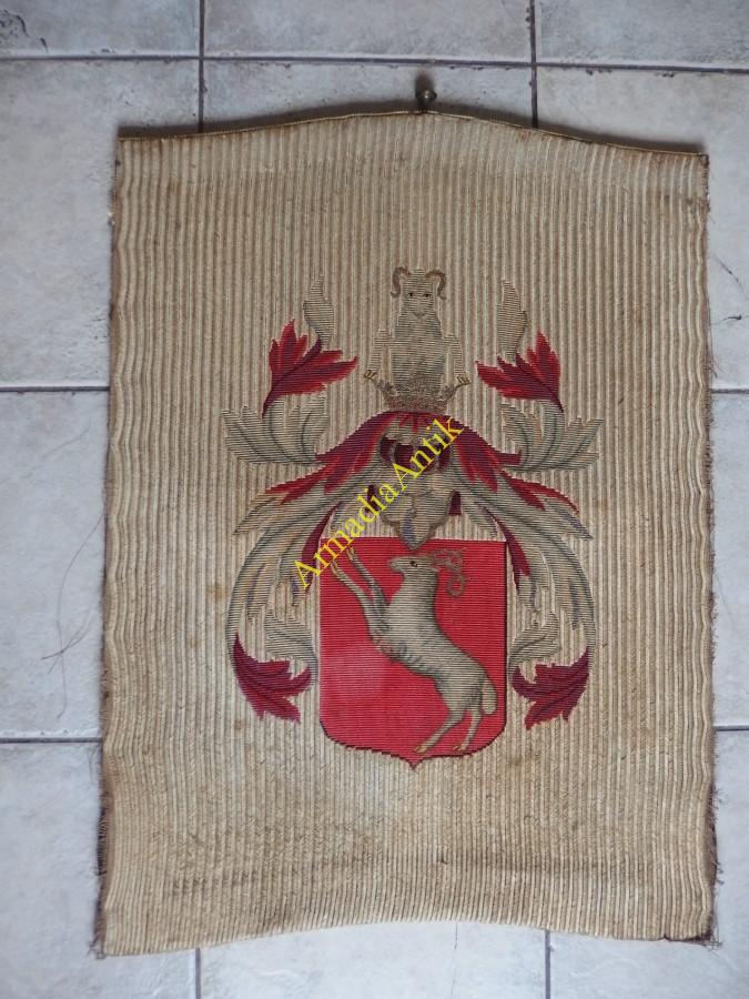 Textilre hímzett nemesi címer, eredeti régi keretre feszítve.