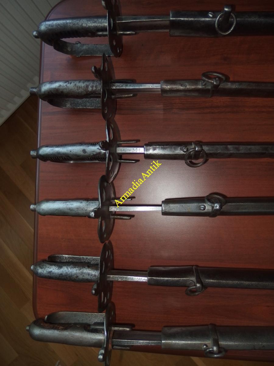 M 1769/75 nehézlovassági pallos. A hárítólapba beforrasztott markolattüskék távolsága változó, a hüvely vastagságától függő . Így előfordul, hogy a korábbi, „duci” hüvely, a későbbi típus, szűkebben elhelyezkedő tüskével szerelt pallosait nem fogadja be.