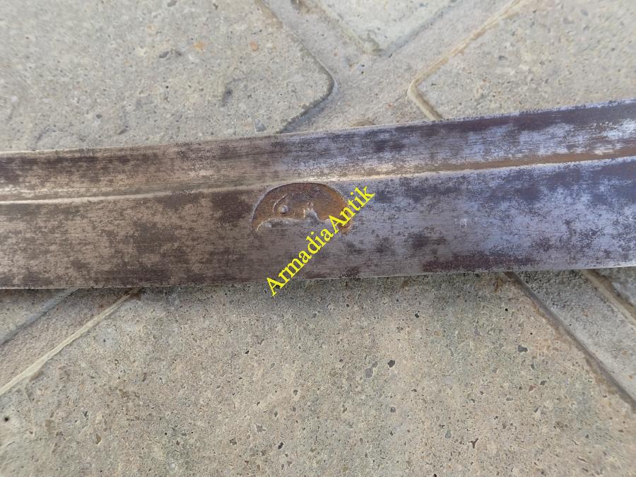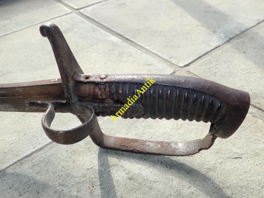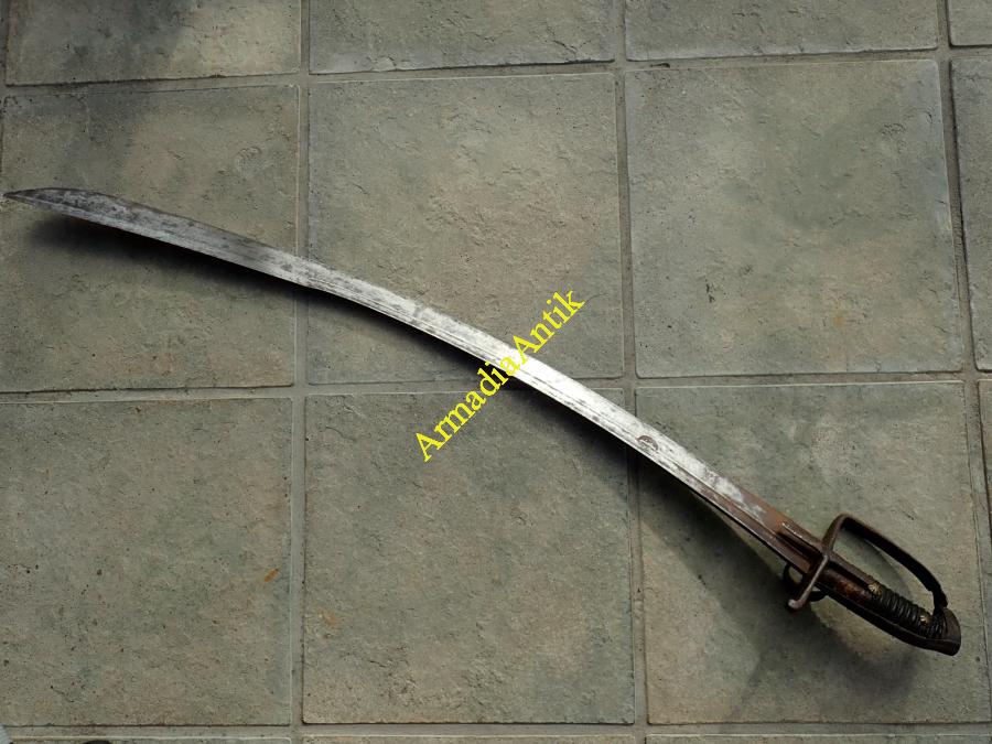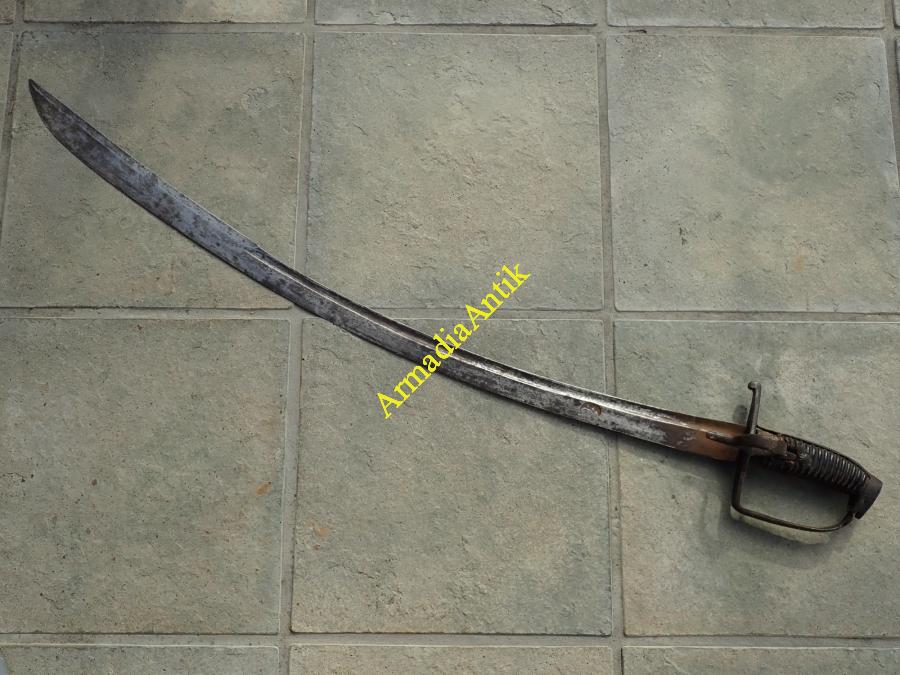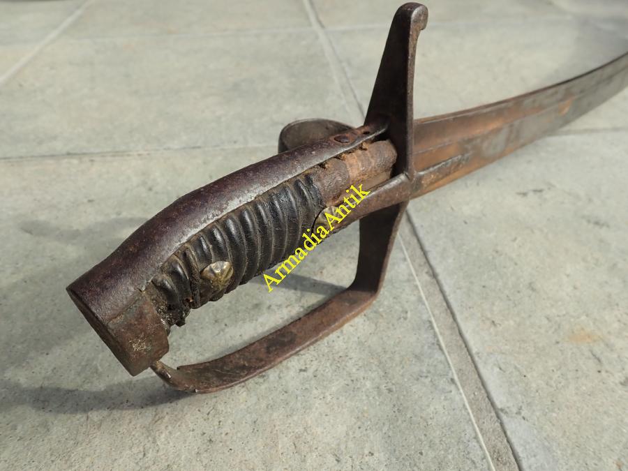 Magyar vas szerelvényes, hüvelykvédős, harci huszárszablya. Hosszú, kiugró fokéles, mindkét oldalán félholdas mesterbélyeges pengével. Zárt kézvédőkengyellel.