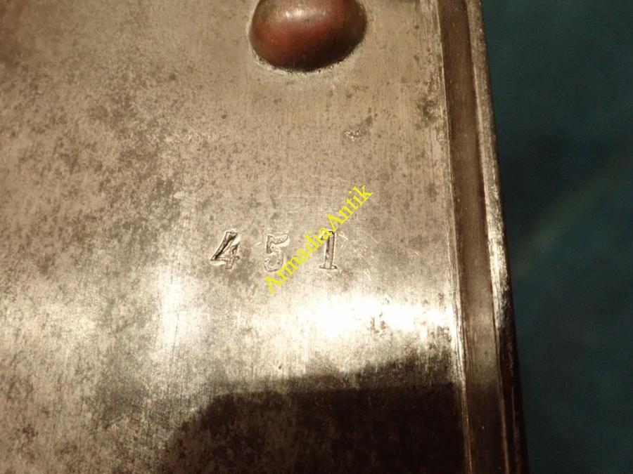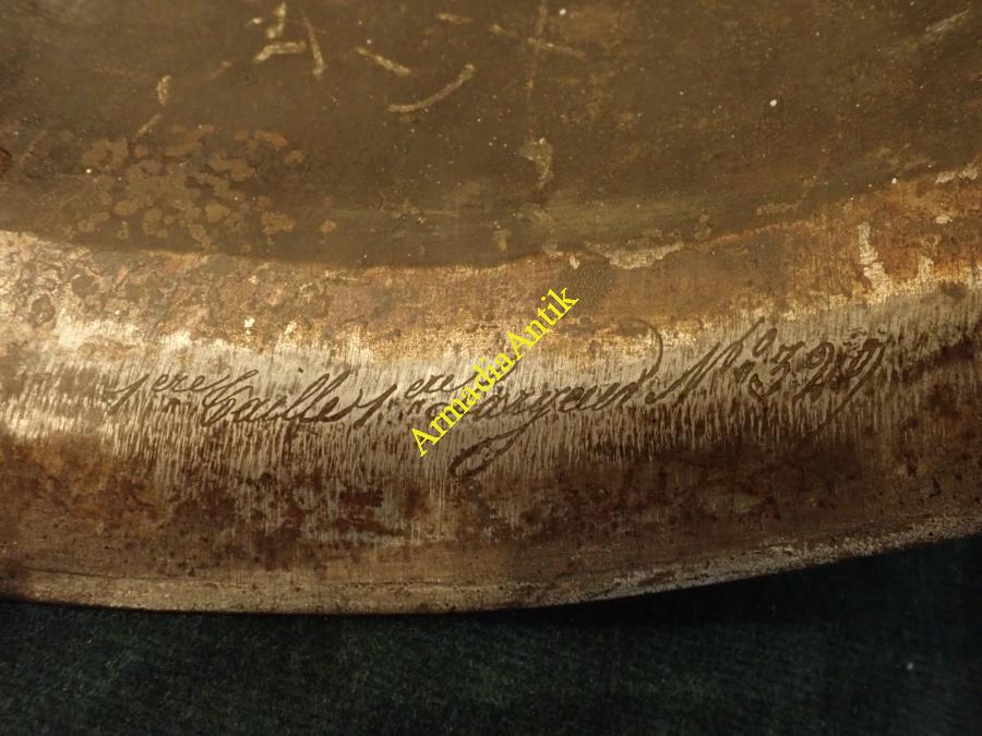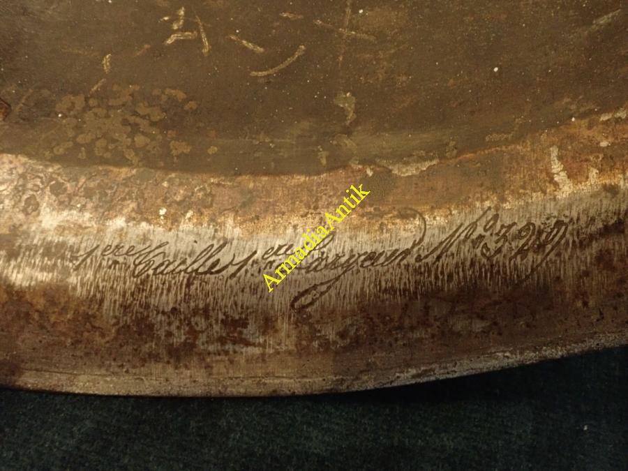 A belső részen, alul, a francia fegyvereken megszokott módon bevésett felirat szerint Az 1. lándzsás ezred No 329-es és a császári Chatellerault-i műhelyben készült, 1862-ben. A képeken látható előkerülési, tisztítatlan, patinás állapotban. Rendkívül dekoratív, így lakás enteriőrbe és gyűjteménybe is jól beilleszthető történelmi darab.
